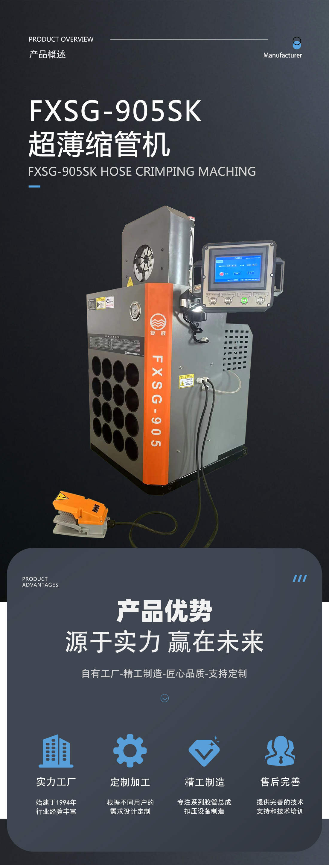 我公司新研發(fā)成功了超薄系列縮管機(jī),扣壓重復(fù)精度可達(dá)到0.1mm。超薄的結(jié)構(gòu)形式克服了傳統(tǒng)環(huán)形扣壓機(jī)固有的不足,能夠非常方便的扣壓形狀復(fù)雜的高壓油管總成和異型軟軸軟管。此款機(jī)器外觀尺寸更小,采用人性化設(shè)計,更方便使用者操作。控制系統(tǒng)采用的是PLC+觸摸屏模式,位移傳感器采集信號精度高,系統(tǒng)可采用手動、半自動和全自動三種模式,用戶可根據(jù)實際加工的工況非常方便的進(jìn)行選擇,從而大大提高加工效率。在您使用的過程中如遇到有不方便之處請及時與我們聯(lián)系,我們將以不懈的努力提高您的產(chǎn)品質(zhì)量和工作效率。